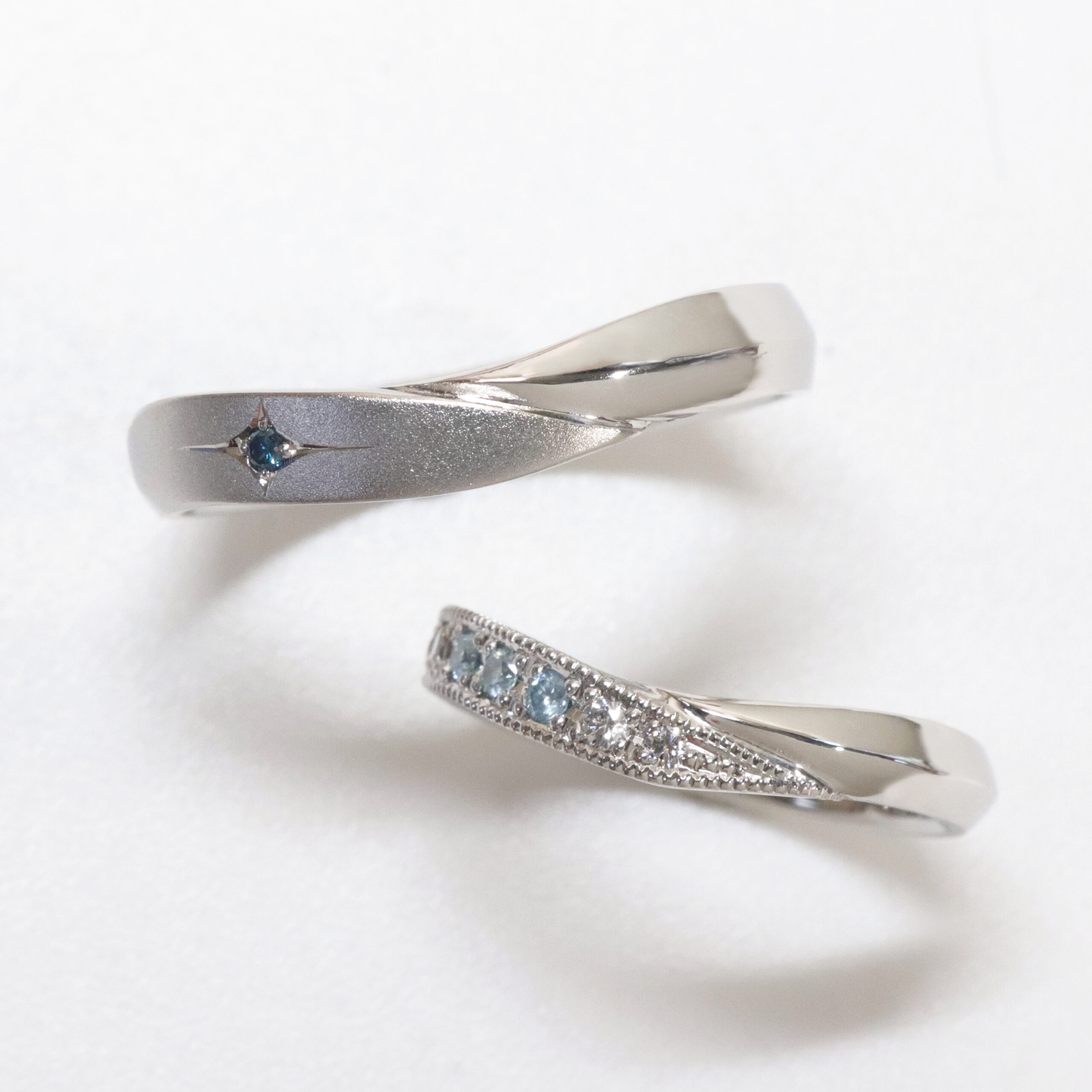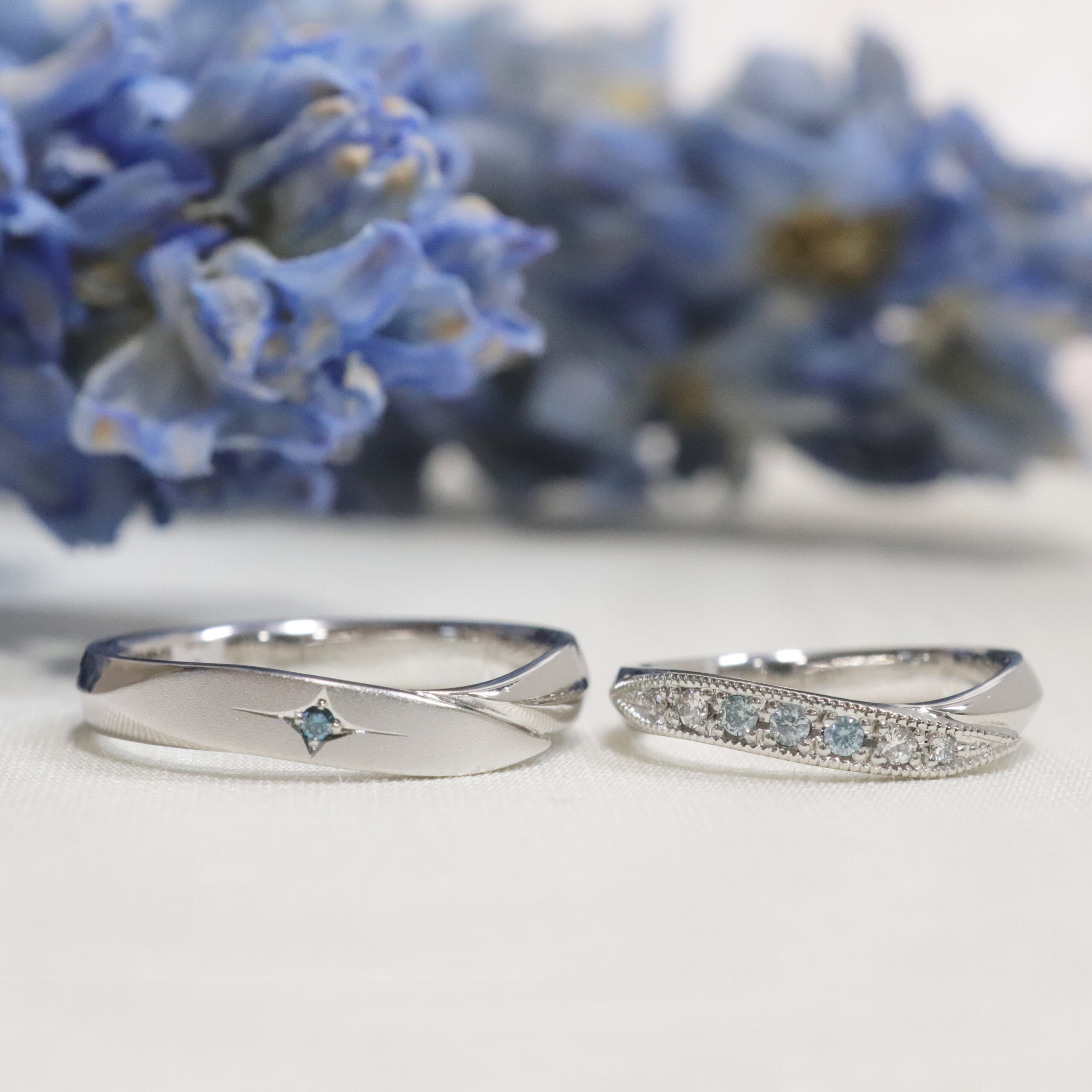 お揃いのアイスブルーのカラーダイヤが目を引く結婚指輪です。ゆるやかなVラインのフォルムを上下で重なり合うような立体的なクロスラインで仕上げ、二人が寄り添い支え合う姿を表現したデザインがベースになっています。