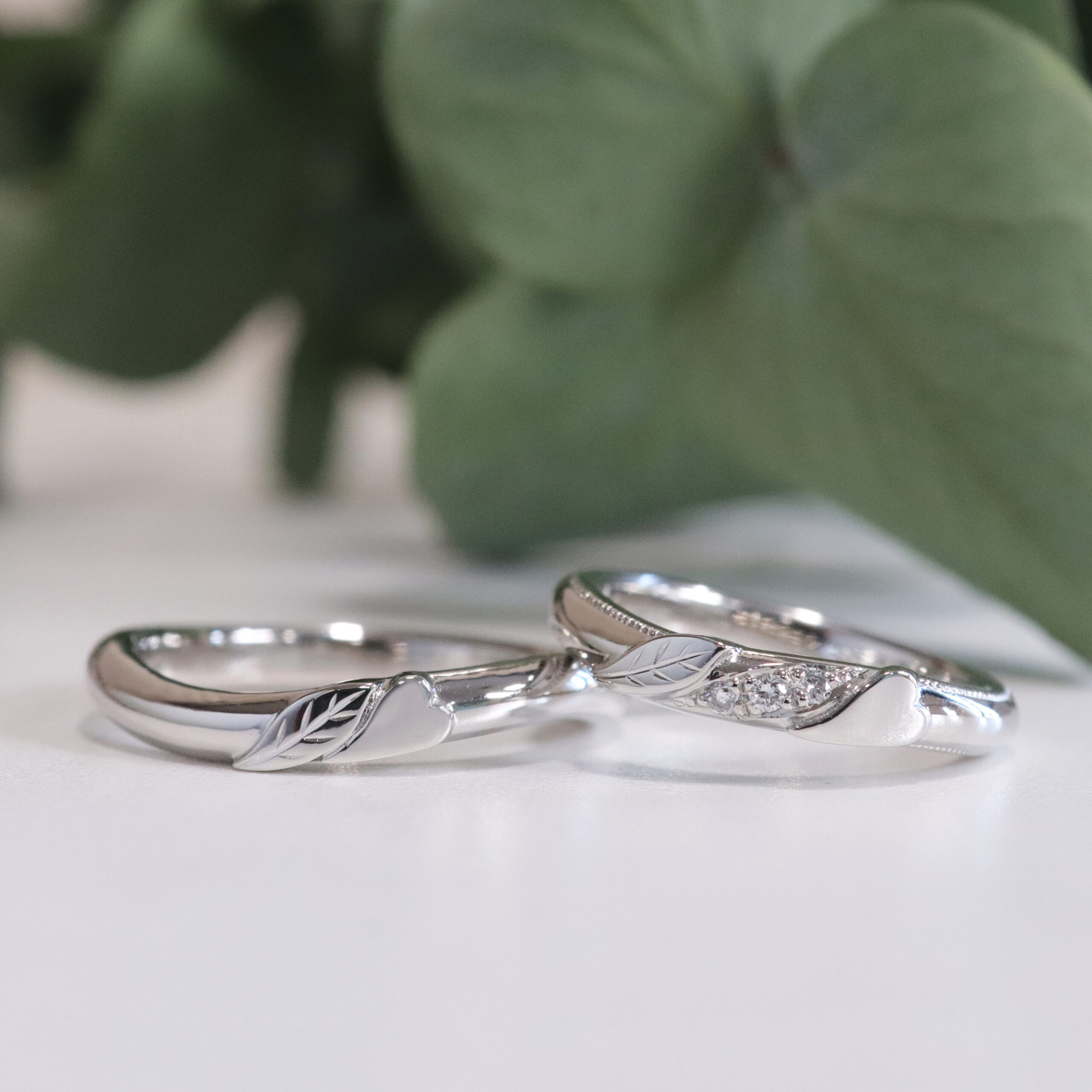 右 プラチナ 幅2.5mm ダイヤモンド3石、ミル打ち、レーザー彫り
