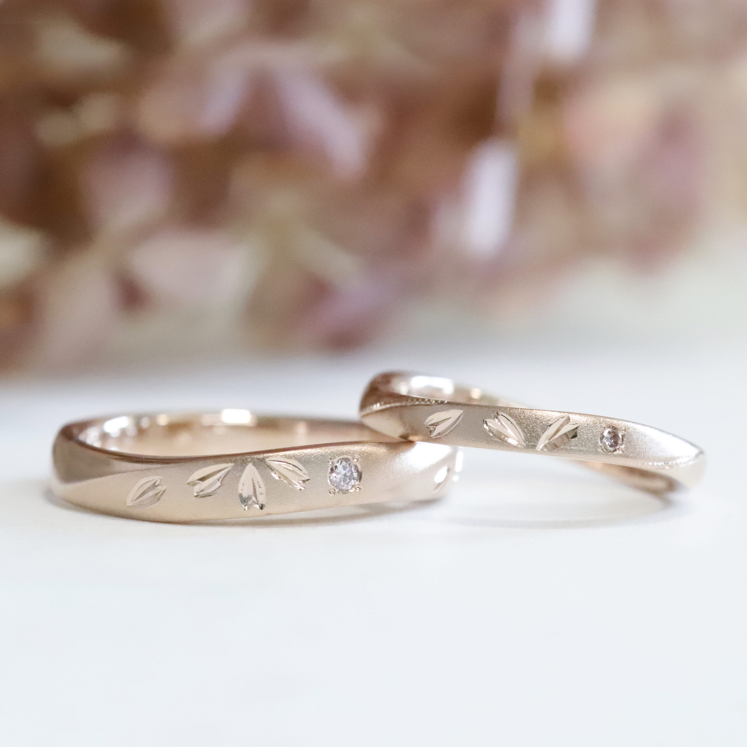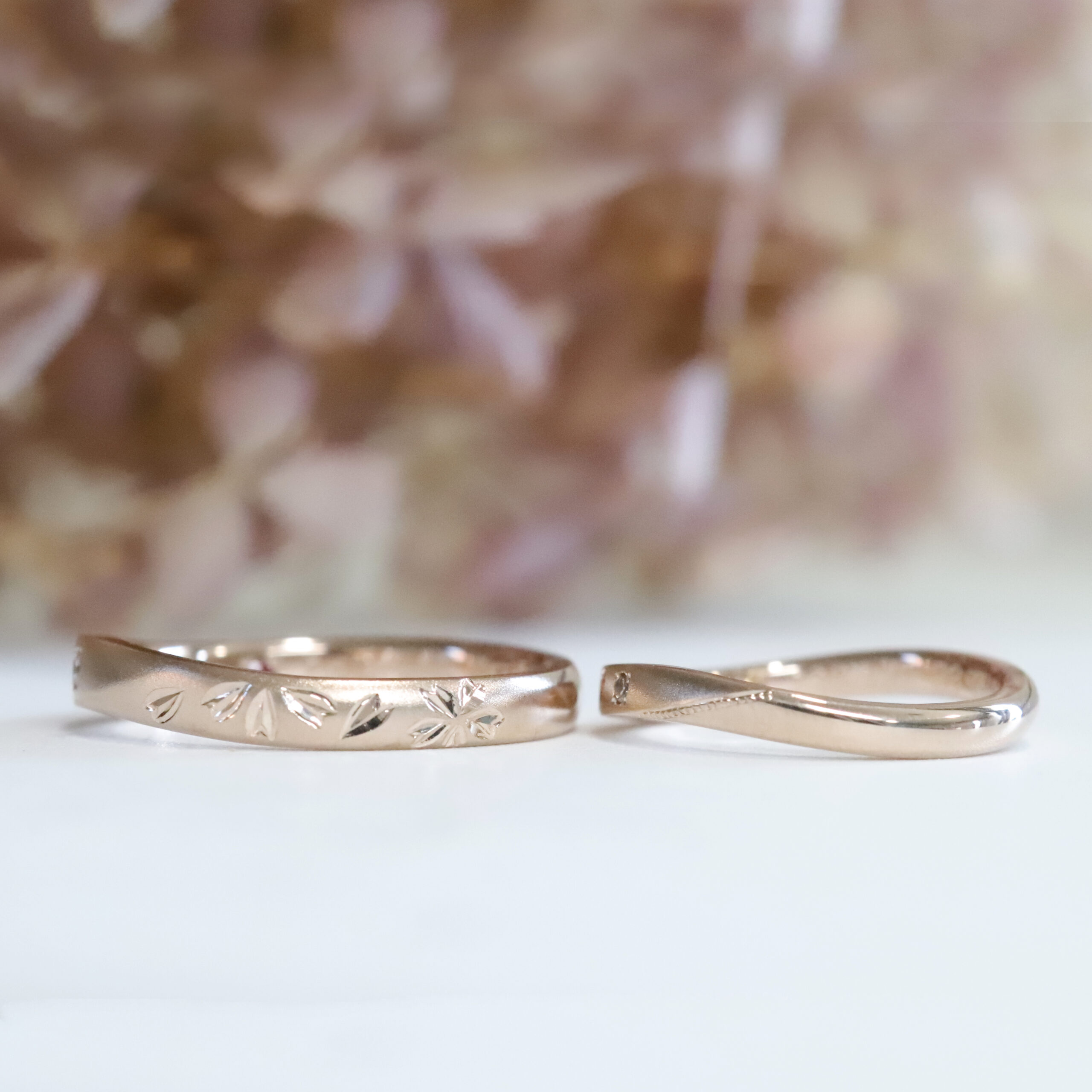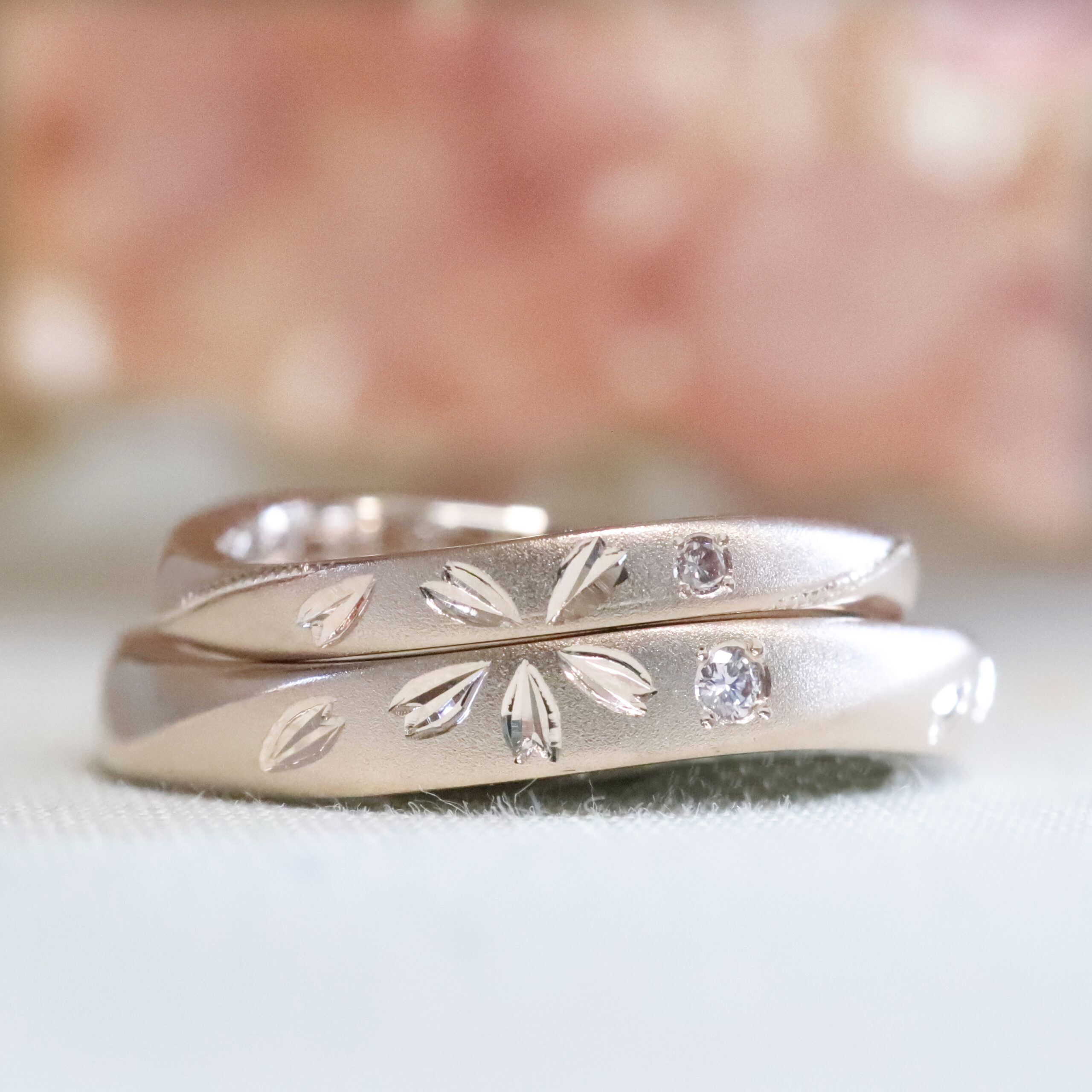 桜のイメージにピッタリなピンクゴールドに、様々な桜を手彫りで表現した結婚指輪です。2本をそっと重ねるとひとつの満開の桜が完成します。