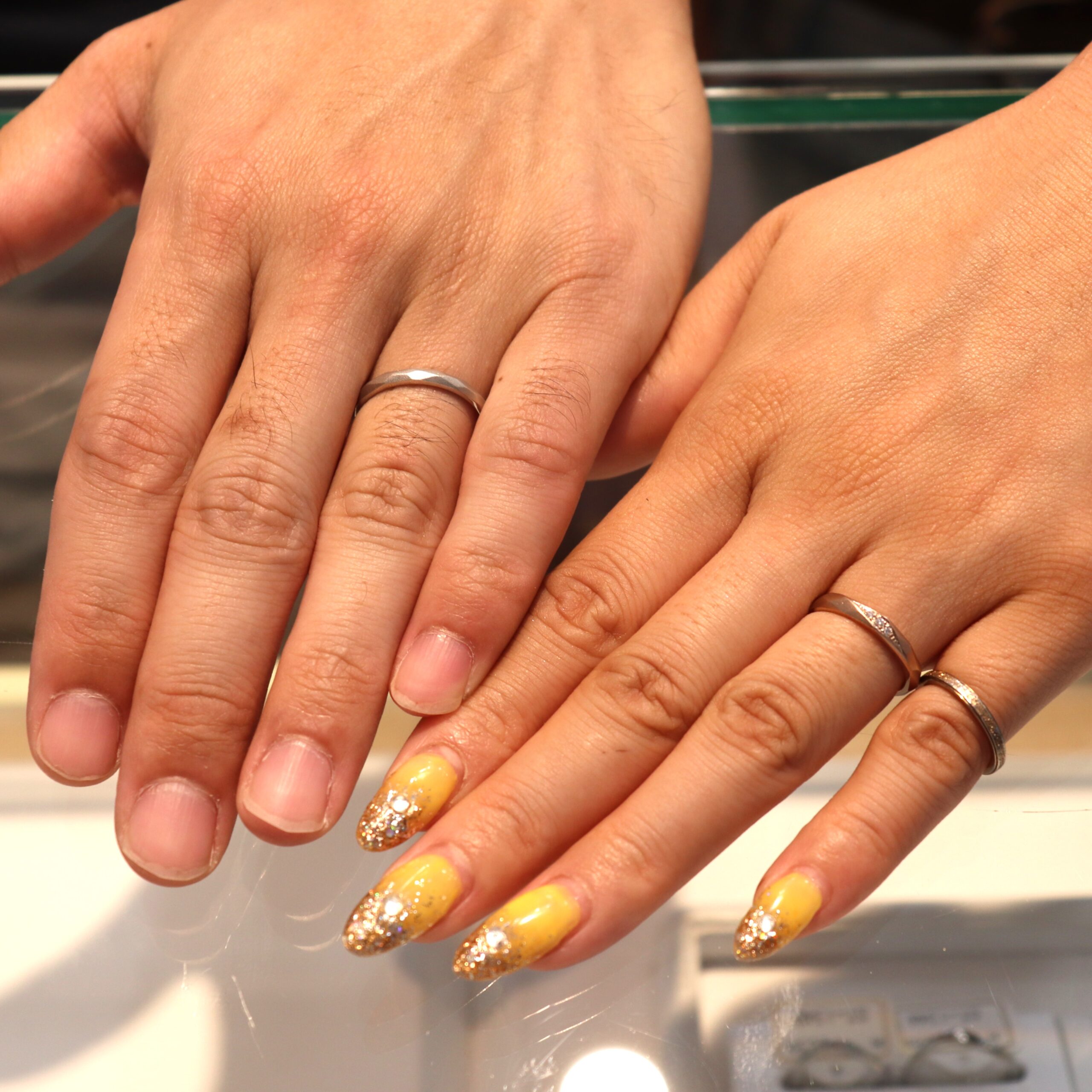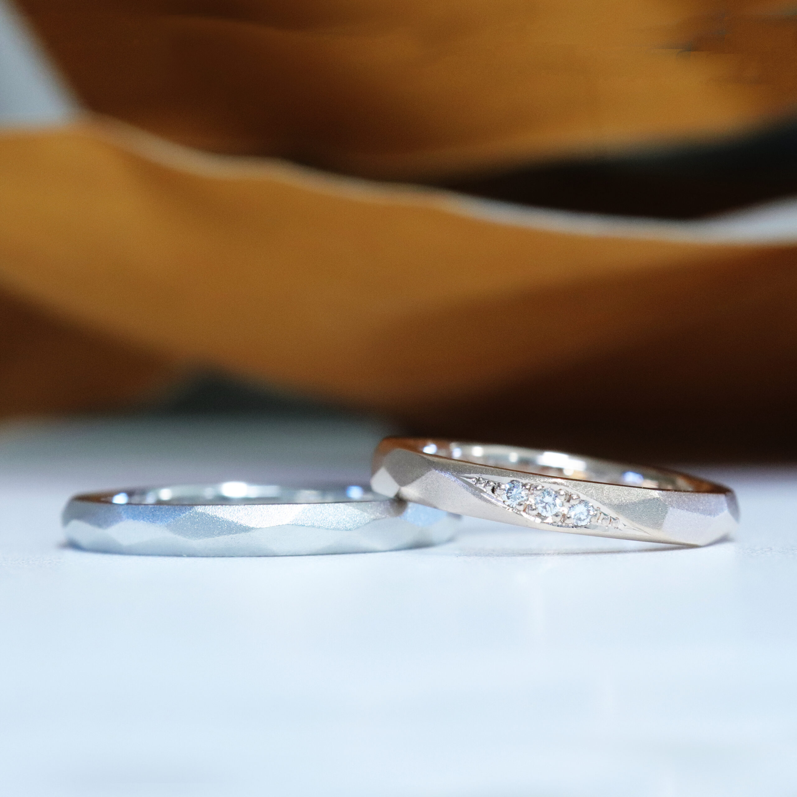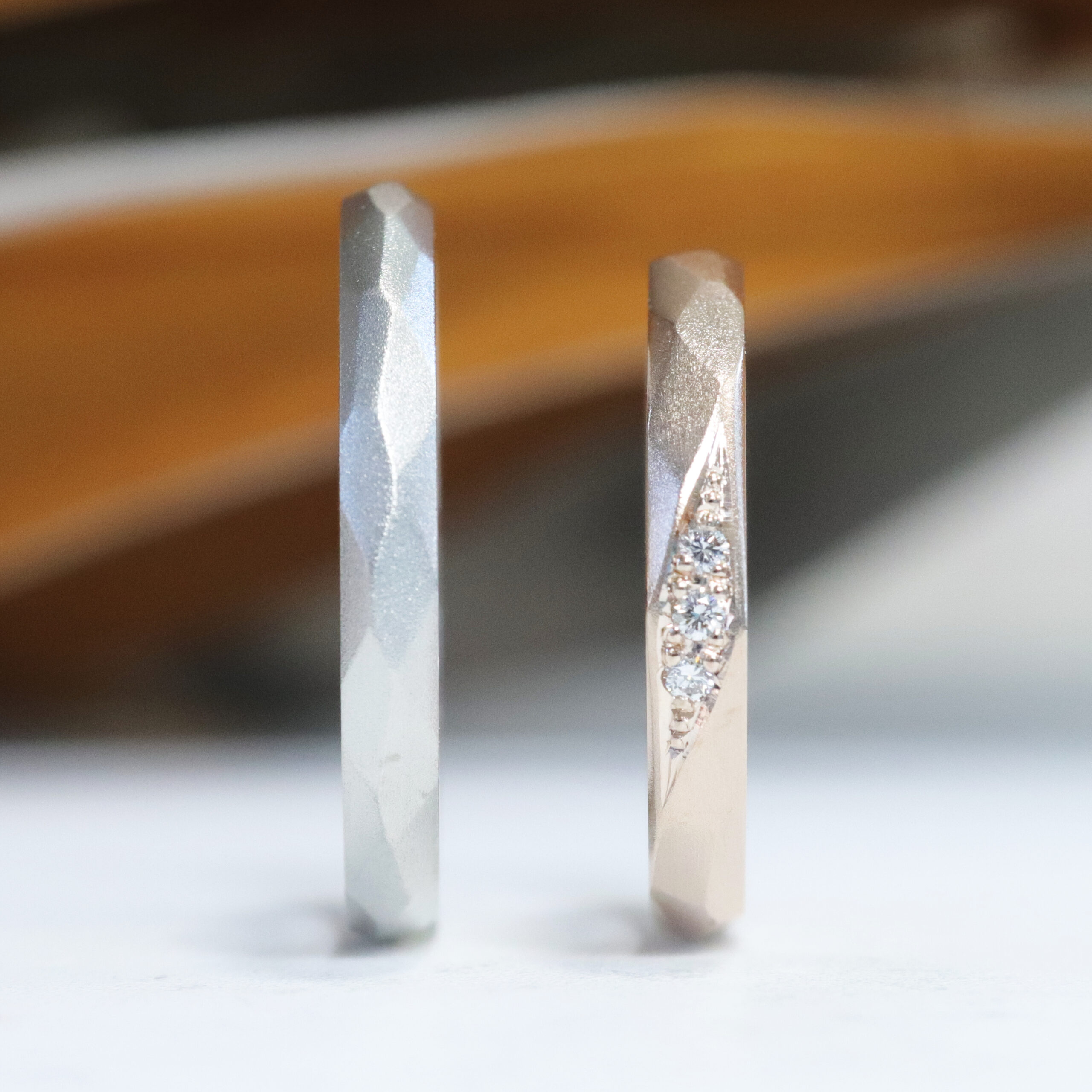 ヤスリで丁寧に削り出した複数の面が連なる結婚指輪です。形の異なるランダムな面は光を受ける角度によって表情が変わり、落ち着いたマットの質感の中に繊細な陰影が生まれます。