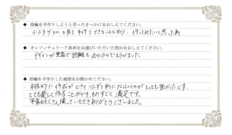 この度は結婚指輪・婚約指輪専門店オレフィチェリーア高林浜松店で結婚指輪を手作りしていただき、誠にありがとうございました!