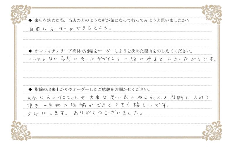 大切な人のイニシャルや大事な思い出のねこちゃんを内側に入れて頂き、一生物の指輪ができてとても嬉しいです。大切にします。ありがとうございました。