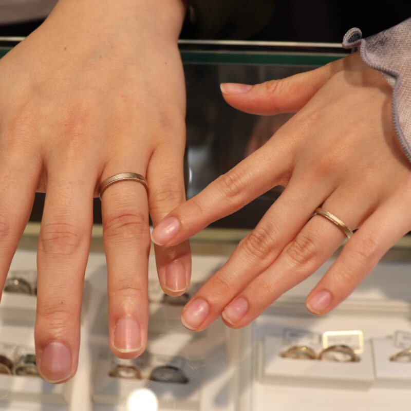 K18シャンパンゴールドの平打ちと甲丸リングの表面に職人が手作業でテクスチャーを刻んで仕上げた結婚指輪をお作りしました。