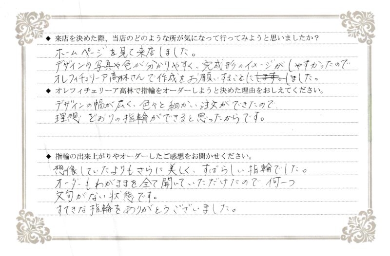 想像していたよりもさらに美しく、すばらしい指輪でした。オーダーもわがままを全て聞いていただけたので、何一つ文句がない状態です。すてきな指輪をありがとうございました。