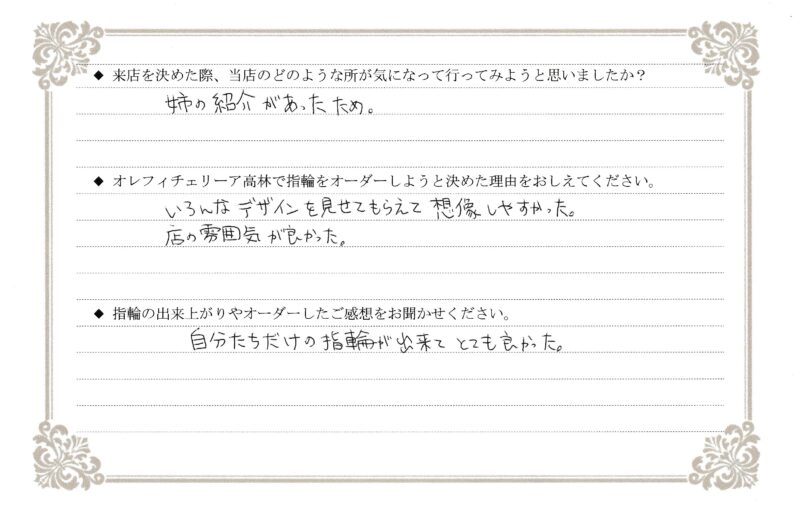 ◆オレフィチェリーア高林で指輪をオーダーしようと決めた理由をおしえてください。