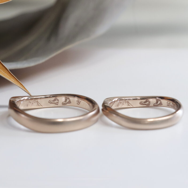 ウェーブラインに合わせてダイヤモンドを7石入れた華やかな結婚指輪に、内側はおふたりが好きな登山をモチーフに山と登山靴の刻印をお入れしました。