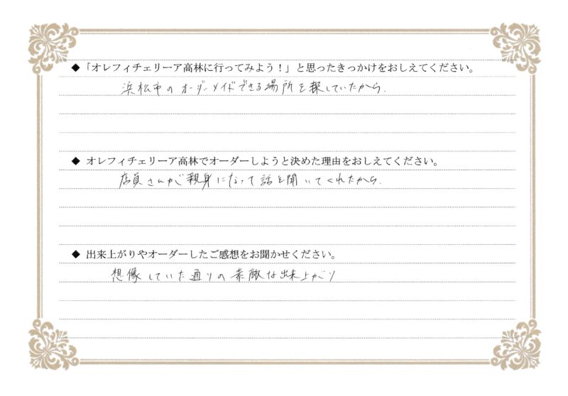 スタッフの対応が当店でオーダーいただく決め手になったとのこと、大変喜ばしく思います。出来上がりにもご満足いただけてよかったです。