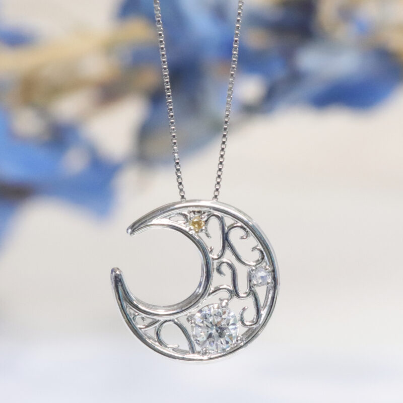 初めおひとりでご来店いただき、ダイヤモンドのルースでプロポーズすることに。その後、おふたりで来店され、イニシャルや誕生石をとり入れたオリジナルのデザインでネックレスを作製しました。