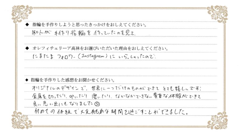 この度は結婚指輪・婚約指輪専門店オレフィチェリーア高林浜松店で結婚指輪を手作りしていただき、誠にありがとうございました!