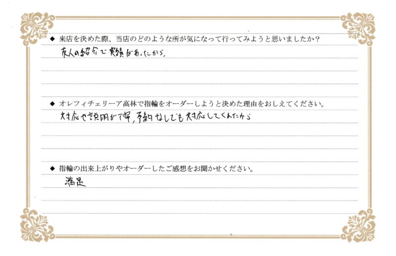 ご紹介でご来店いただき、誠にありがとうございます。対応や説明についてもあたたかいお言葉をいただき、とても嬉しく思います。指輪の仕上がりにもご満足いただけたとのことで安心いたしました。