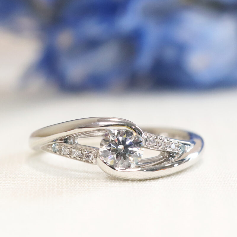 おひとりで来店され、ダイヤモンドを包み込むような流れるフォルムが美しいデザインの婚約指輪をオーダーいただきました。サイドのメレダイヤにプラスしたブルーのカラーダイヤモンドがさりげないアクセントとなり、特別感を添えています。